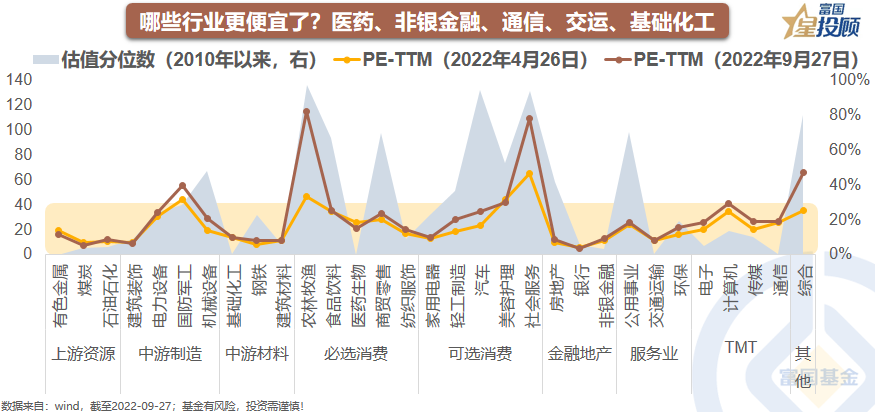 哪些行业更便宜了?医药生物、基础化工、非银金融、交通运输、通信的估值分位数均小于3%,已经处于历史上极度便宜的状态;而相比于“4·26”,煤炭、医药生物、有色金属、银行便宜14%+以上,而农林牧渔、机械设备、社会服务、汽车等近期受市场青睐的板块,估值反而进一步拔高。
