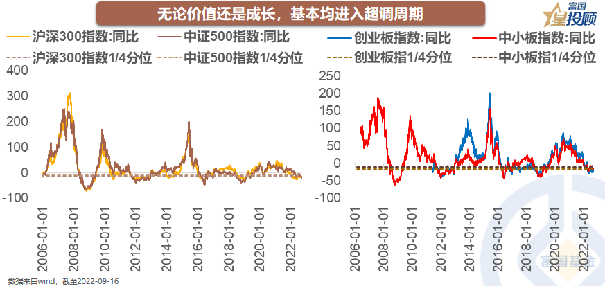 底部区域,选成长还是选价值?无论大盘还是小盘,价值还是成长,均已进入超调周期;从数据上看,沪深300、中证500、创业板指和中小板指的同比走势(也即年度回报走势)基本上均已走入历史最低15%分位区间,但这些指数成立以来的年收益均值都在16%以上,最近一年的回报基本在-18%至-24%之间。每一次破位都是极致悲观情绪的释放,极度的偏离之后即是修复之路。万物皆周期,A股亦如此。