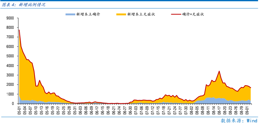 本轮疫情感染量级低于4月,但扩散范围较大。8月初扩散的本轮疫情单日新增病例人数最高也仅超3000例,但扩散范围较广,截至目前,全国仅宁夏无确诊病例,疫情较为广泛的扩大进一步压制了经济复苏的预期。
