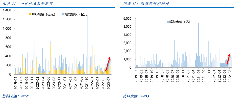 资金需求方面,本周一级市场规模有所增加,限售股解禁压力下行,重要股东减持。本周一级市场资金募集金额合计560.07亿元,较上周增加72.29% ;结构上,IPO募集125.32亿元,周环比减少39.12% ;增发募集434.75亿,周环比增加264.61% 。本周限售股解禁规模合计1475.05亿元,周环比增加18.21% ,根据目前披露的数据,预计下周解禁规模约504.87亿元,解禁压力有所上行。本周重要股东减持73.15亿元,上周减持27.74亿元。