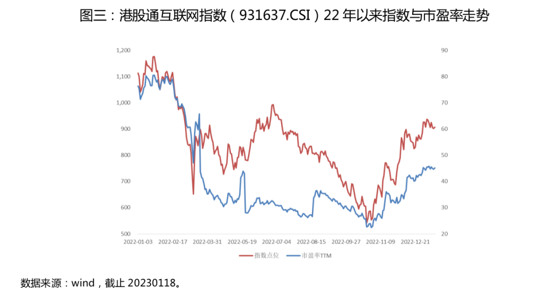 回到本轮反弹,前期市场上涨更多的是受益于风险偏好的改善。级掌柜以港股通互联网指数(931637.CSI)22年以来的指数点位和市盈率数据分析,本轮上涨区间(2022年10月31日~2023年1月18日)中恒生指数累计上涨47.60%,而市盈率上涨了46.33%,可以说本轮反弹几乎全部由市盈率上的改善推动。