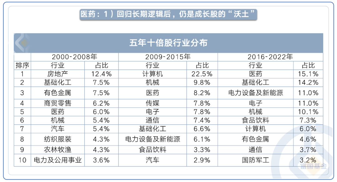 在过去三轮牛熊时期,医药都是牛股的集中地,2000年—2008年那一波,医药五年十倍股占比达6.4%,排名第五位;随后在2009年—2015年的市场中,医药“牛股”占比8.2%,排名第三;在2016年至2022年这一波市场中,医药行业表现更亮眼,五年十倍股数量跃居第一位,占比达15.1%。