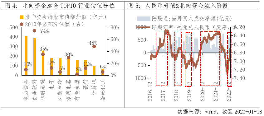以史为鉴,自深港通开通以来,人民币升值叠加北向资金持续净流入的阶段包括2017年1月至2018年1月、2018年11月至2019年3月、2019年9月至2020年1月、2020年11月至2022年2月,其中最短持续时间为5个月。本轮北向资金自11月以来持续流入2个月半,在国内外经济周期错位、美联储加息周期放缓的背景下,中国经济复苏预期最为明确,有望吸引全球资金加大对于中国权益资产的配置力度,预计北上资金流入仍有一定的持续时间。