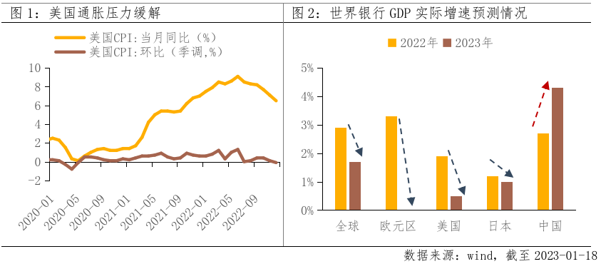 海外经济衰退周期升温,国内经济复苏预期强化。在美欧央行紧缩的背景下,全球经济衰退的压力显现,1月10日世界银行发布《全球经济展望》,将2023年全球经济增长从6个月前预测的3%降至1.7%,全球经济面临急剧放缓风险。而中国在2022年底地产纾困政策和防疫优化政策密集发布后,基本面预期持续改善,多家外资机构上调中国2023年GDP增速的预测。随着全国各地疫情逐渐度过高峰期,以及中央经济工作会议后扩内需、稳增长政策持续落地,2023年中国经济有望率先复苏。
