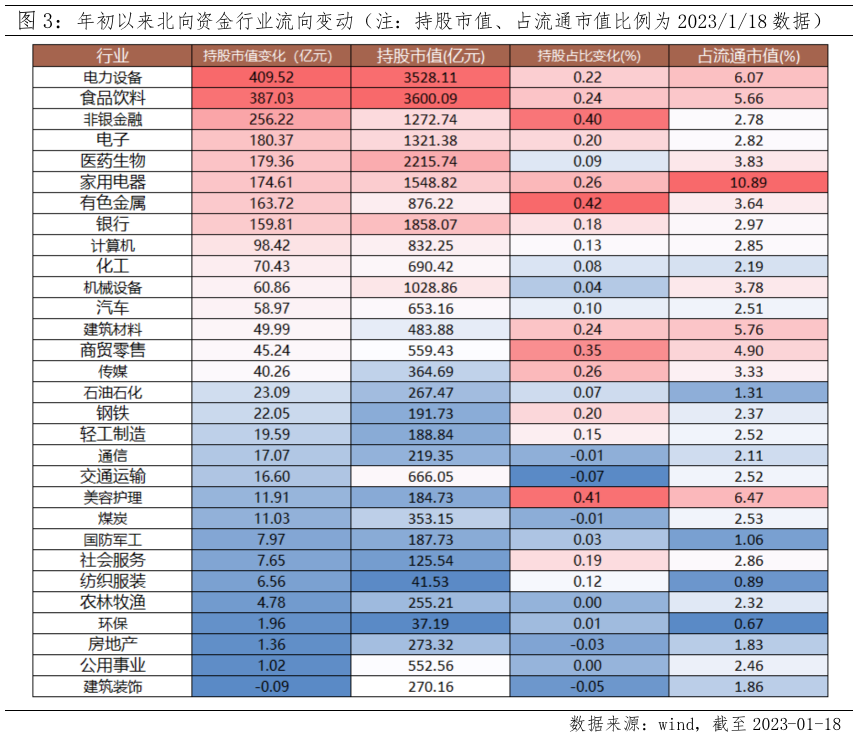 从北向资金持股市值看,电新、消费、金融板块存量高且增加额居前。2023年1月1日至18日,北向资金持股市值增加额最多的行业分别是电力设备、食品饮料、非银金融、电子和医药生物,其中食品饮料和电力设备仍是当前北向资金持股市值的TOP2行业。