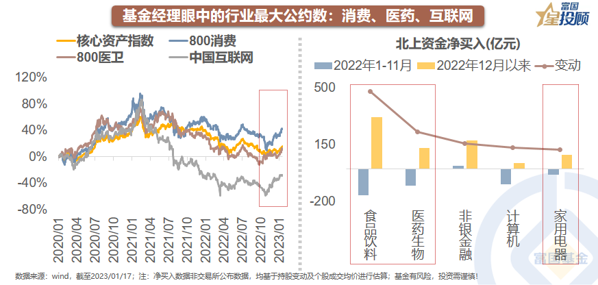 基金经理眼中的行业最大公约数有三个:消费、医药和互联网。这三大行业如“难兄难弟”,自2021年初核心资产落寞后,就一路回调,“核心资产信仰坍塌”的声音更是此起彼伏。但正所谓风险是涨出来的,机会是跌出来的,自2022年四季度以来,三大行业先后强势反弹,资金也重新涌入。