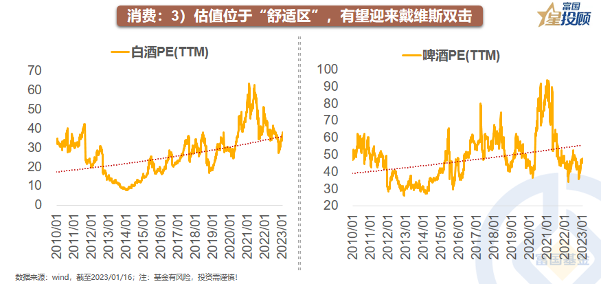 看好消费的逻辑三:估值行至“舒适区”,有望迎来戴维斯双击。以两大子行业为例,啤酒:PE已回落至2016年以来的31%分位;且消费升级趋势下,22年表现抗跌,23年消费场景将打开,虽然这两年成本压力高,报表仍表现很好,未来一两年随着成本下降,报表弹性明显。白酒:估值已经可以和2018年相匹敌,且高端白酒的品牌韧性越来越强,估值和基本面都有望边际改善。