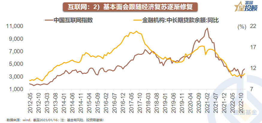看好互联网的逻辑二:基本面会跟随经济复苏逐渐修复。广告费收入是互联网行业的核心构成,而广告费收入与宏观环境息息相关。特别是在“宏观环境改善+渗透率大幅上升”的2020年,互联网行业取得了盈利与估值的双重上涨。从指标上看,互联网指数走势和中长期信贷增长亦步亦趋,后续随着中长期信贷增长探底回升,也有望支撑互联网指数走强。