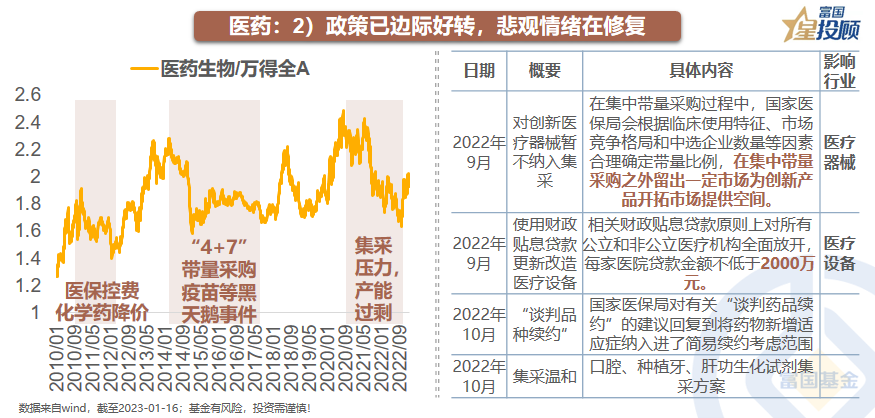 看好医药的逻辑二:政策已边际好转,悲观情绪在逐渐修复。回顾历史,医药行业的走势和政策是高度契合的,当政策收紧时,往往会明显下杀。2021年中,集采政策不断超预期,医药行业跌跌不休,但自2022年9月以来,集采政策趋于温和、财政贴息贷款推行,政策“最坏的时候”或已过去,可以更加乐观一些。