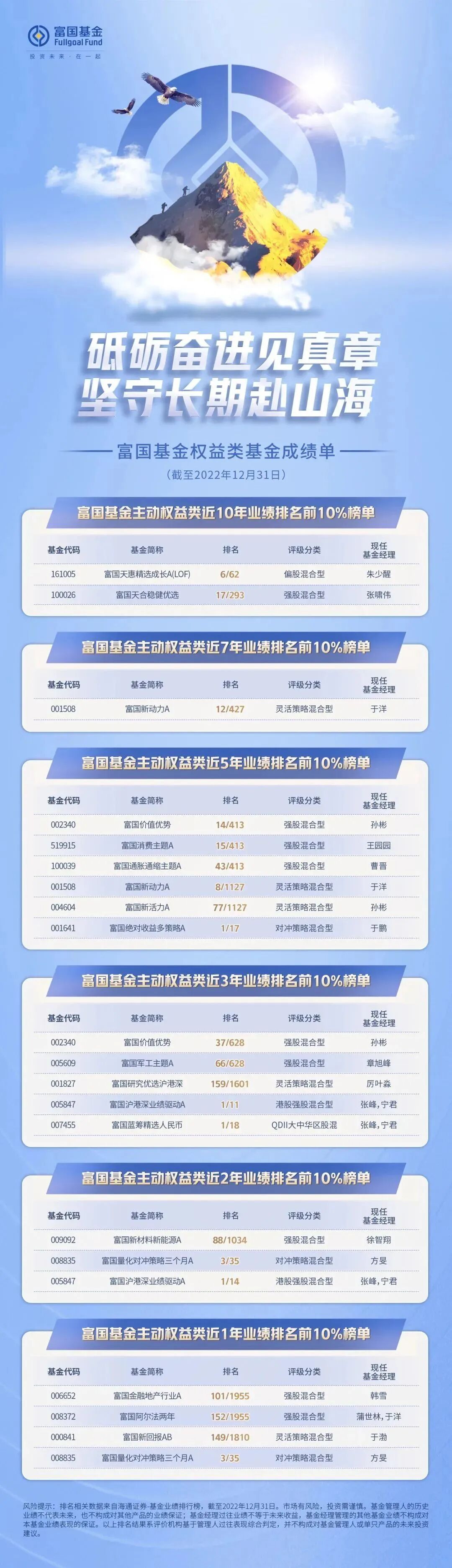 但对于富二家的基金经理们来说,以不变应万变才是长久之道。今天想跟大家分享的是海通证券最新发布的《基金公司权益及固定收益类资产业绩排行榜》,这份2022年收官成绩单也印证了富二家在市场的震荡与分化中坚守长期的突出能力,一起来看看~