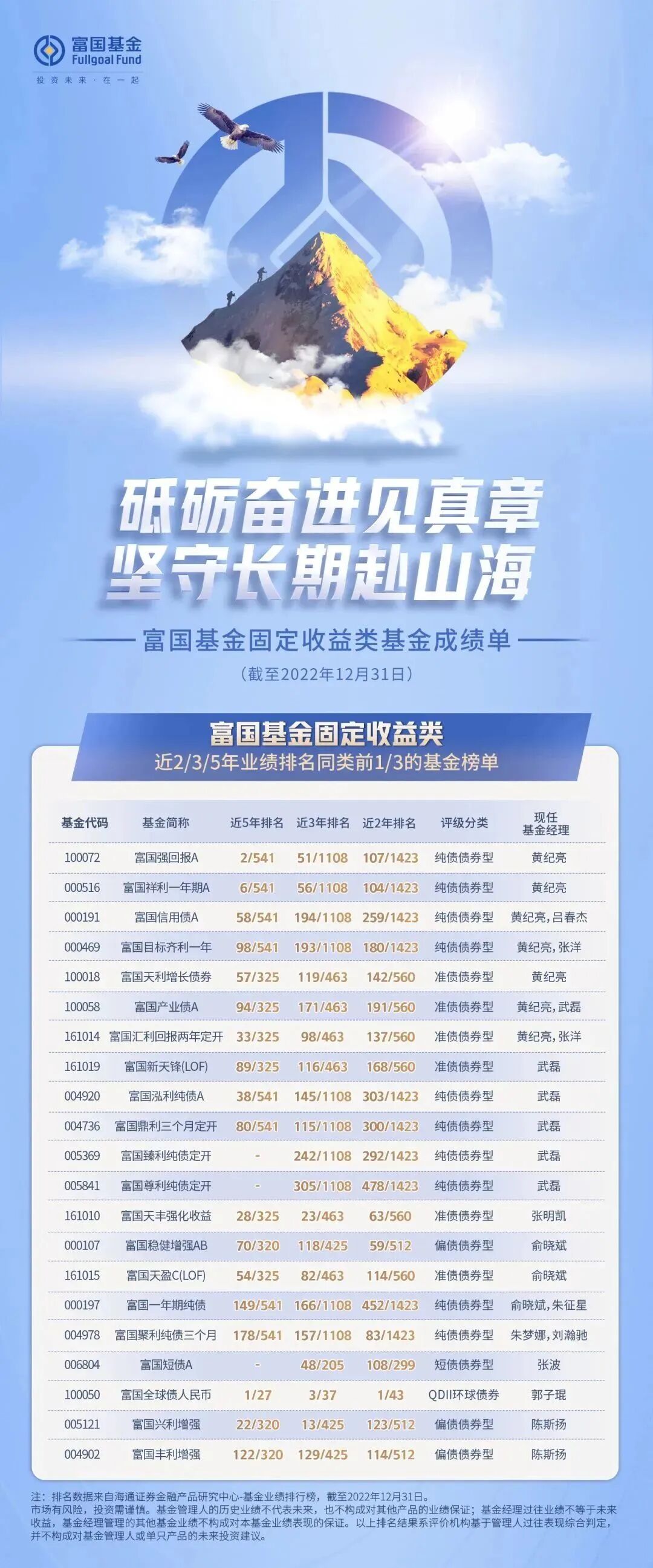 除了在权益投资领域有深厚的积淀,富国基金在固定收益投资领域也进行了长期深入布局,海通业绩榜单数据显示,富二家固收类产品业绩在多个区间维度排名靠前,近2/3/5年业绩排名同类前1/3的基金共21只。覆盖纯债基金、定开债券基金、二级债基等多类产品,汇集了黄纪亮、武磊、吕春杰、张明凯、俞晓斌、朱梦娜等众多实力派基金经理,为持有人带去良好的持基体验。