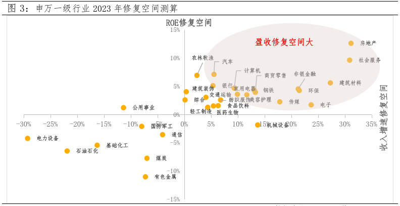 以疫情前2015-2019年各行业ROE和营业收入增速的中位数为基准,测算各行业最新财报数据与该中位数的差值,以此衡量2023年各行业的修复空间:下图右上方的行业盈利和收入增速相比疫情之前还有较大差距,理论上未来修复空间较大,可以看到修复空间的领域集中在地产及地产链(房地产、建筑材料)、金融(非银金融、银行)、可选消费(社会服务、商贸零售、美容护理)以及TMT(计算机、电子、传媒)。