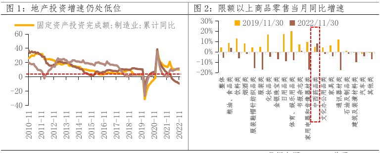 11月经济数据整体疲弱,投资和消费仍有提升空间。其一,低基数下地产投资存在一定修复空间。2022年1-11月固定资产投资同比增长5.3%,其中基建和制造业投资增速已经恢复至高于疫情前水平,而地产投资增速仍处低位,随着地产支持政策的效果显现,地产或将走出泥潭。其二,消费上修空间较大。受全国多地疫情爆发影响,2022年11月社零同比增速下降5.4pct至-5.9%,低于预期;限额以上商品零售同比增速中,仅有中西药品类高于2019年同期水平;而2023年元旦假期出行数据、消费数据等修复情况也表现一般。随着国内逐渐度过疫情高峰期,消费存在较大的修复空间。