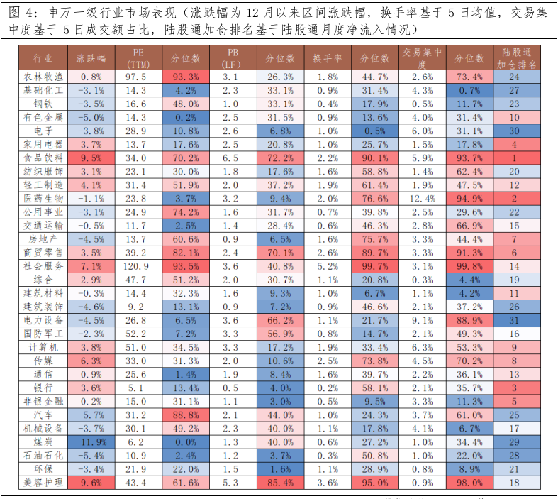 从当前市场表现看,交易疫后复苏已有一定的时间。从估值来看,消费板块的食品饮料、商贸零售、社会服务的估值已经恢复至历史较高分位;金融和地产估值仍处历史低位,但在11月稳增长政策加码以来,其估值回升幅度均超10%。从换手率和交易额占比来看,消费板块(食品饮料、商贸零售、社会服务、美容护理)、医药生物、TMT(计算机、传媒)受到了市场的青睐。从北向资金月度净流入额来看,北上资金重点加仓的领域集中在消费(食品饮料、家用电器)、医药和金融(银行、非银金融)。