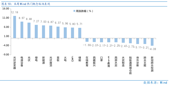 硅料降价带动光伏行业需求高增,叠加市场情绪恢复,资金大局布光伏赛道。从Wind热门概念板块来看,表现相对靠前的是光伏逆变器(12.18%)、电源设备(8.97%)、光伏(8.48%)、绿电(7.27%)、新能源(7%);表现相对靠后的是新冠肺炎检测(-4.09%)、肺炎主题(-3.21%)、体外诊断(-3.11%)、陆股通周增仓前(-2.73%)、水泥制造(-2.47%)。