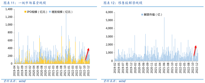 资金需求方面,本周一级市场规模有所减少,限售股解禁压力上行,重要股东减持。本周一级市场资金募集金额合计137.55亿元,较上周减少547.60% ;结构上,IPO募集9.90亿元,周环比减少92.72% ;增发募集127亿,周环比增加0.87% 。本周限售股解禁规模合计983.47亿元,周环比减少32.04%,根据目前披露的数据,预计下周解禁规模约1096.31亿元,解禁压力有所下行。本周重要股东减持48.99亿元,上周减持98.35亿元。