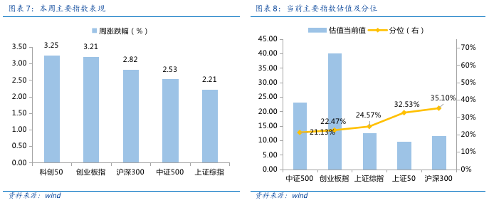 近一周,上证指数上涨2.21%,创业板指上涨3.21%,沪深300上涨2.82%,中证500上涨2.53%,科创50上涨3.25%。风格上,成长、周期表现相对较好,稳定、消费表现较差。从申万一级行业看,表现相对靠前的是计算机(5.15%)、建筑材料(5.08%)、通信(5.05%)、电力设备(4.95%)、家用电器(4.47%);表现相对靠后的是农林牧渔(-1.22%)、社会服务(-0.96%)、交通运输(-0.15%)、美容护理(0.05%)、煤炭(0.06%)。