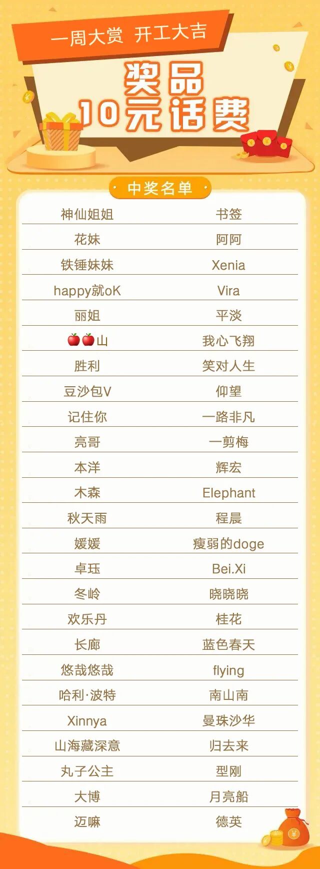 小编将于后台联系获奖的客官,话费将于2月3日(本周五)前充值到中奖客官的手机号码中,请各位客官耐心等待~