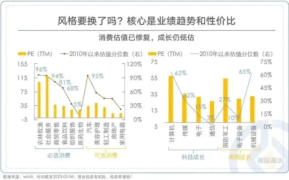 成长方向依然具备“好价格”优势。2022年11月以来的反弹中,消费和价值类的涨幅较大。社会服务、商贸零售、食品饮料等估值已修复至较高水平,进一步制约了消费类上涨的动力。但成长类的板块估值仍在低位。俗话说:再好的东西,也要有一个好价格,当前成长方向依然具备“好价格”的优势。