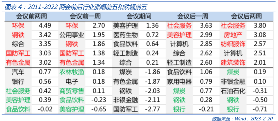 行业层面来看,两会前两周环保、钢铁、军工、有色等周期和公用板块涨幅居前,社会服务、美容护理、食品饮料等消费板块表现落后。两会期间,美容护理、医药生物、食品饮料、轻工制造等消费板块小幅上涨,而煤炭、有色、钢铁、非银、军工跌幅较大。两会后,社会服务、纺织服装、美容护理等消费板块继续保持相对较高的收益,房地产、建筑装饰也相对占优,而以煤炭、钢铁、石油石化为主的周期板块则相对弱势。