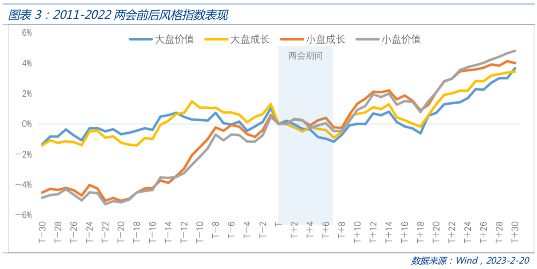 从历年两会前后的市场风格表现来看,两会前一个月小盘风格显著跑赢大盘,成长和价值表现相对均衡。主要由于两会召开前,市场对稳增长政策和产业政策抱有一定预期,两会政策博弈之下,融资资金活跃,市场风格整体偏小盘风格。两会期间,大小盘及成长价值的风格差异逐渐收敛。会议结束一个月后小盘占优,但相对优势相比两会前有所减弱,主要由于随着1、2月经济数据公布及上市公司年报密集披露,盈利端逐渐成为关注焦点,大小盘分化有所收敛,盈利驱动风格切换。