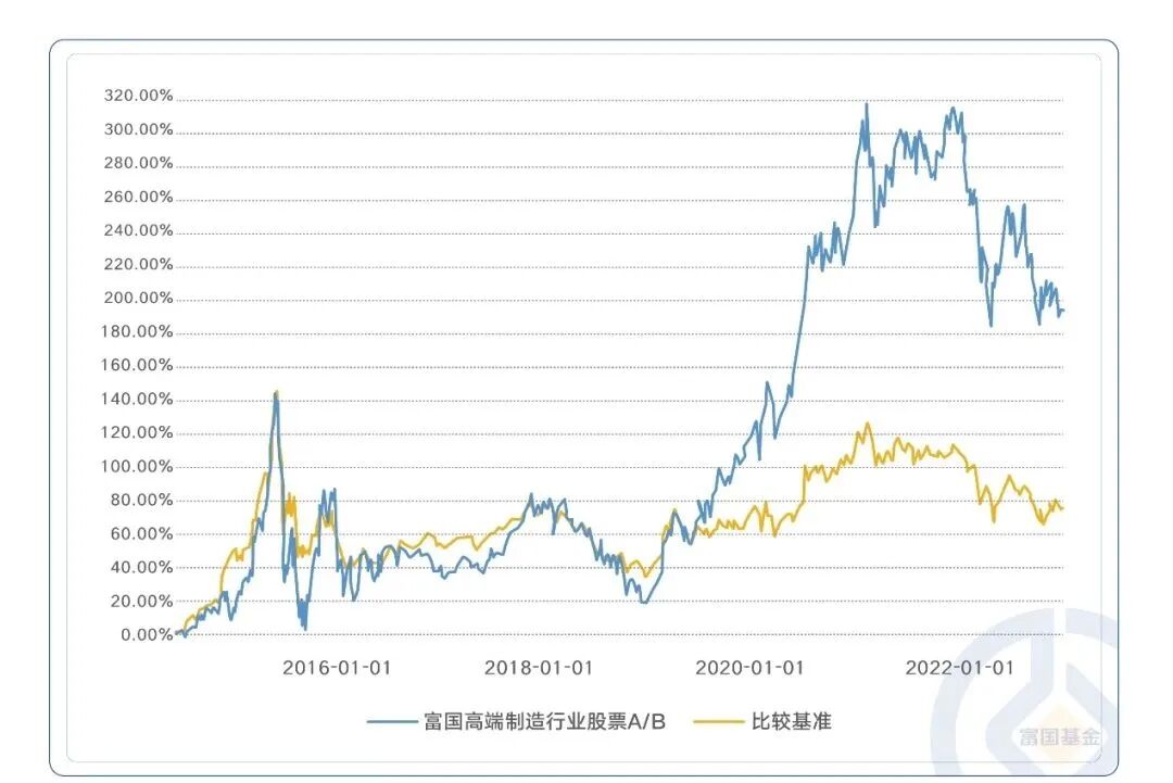 其在管富国高端制造(A类000513,C类014930)在2022年8月获得《中国证券报》颁发的“三年期开放式股票型持续优胜金牛基金”。截至2022年底,富国高端制造A自成立以来净值增长率达191.50%,同期业绩比较基准为74.54%,超额收益达116.96%。