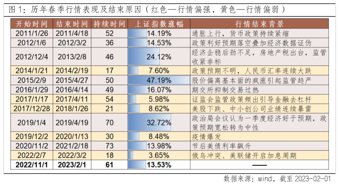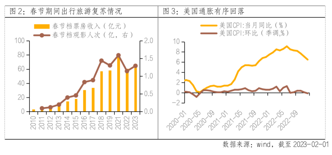 本轮春季行情已持续较长时间,但当前尚未满足行情结束的条件。一方面,疫后复苏预期在春节期间得到初步验证,经济复苏大方向无需置疑。1-2月为宏观数据真空期,预期证实或证伪尚待观察,而从消费高频数据看,春节假期出行旅游、春节档票房、免税均呈现复苏态势,经济复苏置信度提升。另一方面,预计一季度海外无明显风险,国内两会前存在强政策预期。海外方面,周三美联储宣布加息25个基点,连续第二次放慢加息步伐,通胀压力缓和背景下,本轮加息周期或渐入尾声。国内方面,2月份随着两会的临近,稳增长政策预期有望对市场偏好形成支撑,市场涨势有望延续。