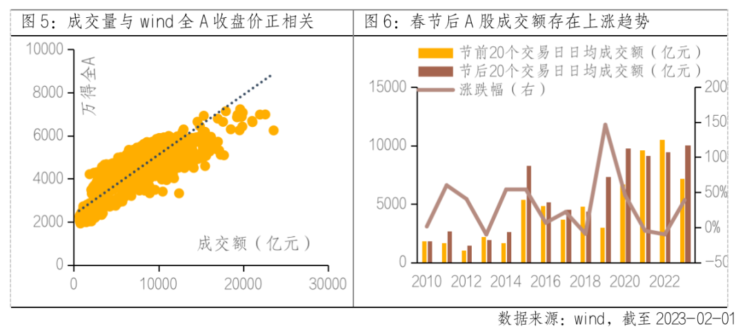 春节后成交额提升,进一步打开市场修复空间。从图4可以看到,2010年来万得全A收盘价与成交额之间存在较为明显的正相关。借鉴历史,2010年来春节假期结束后较春节前日均成交额大多呈现上涨态势,平均涨幅在30%左右,春节后交投情绪的回暖助推A股市场向上打开修复空间。