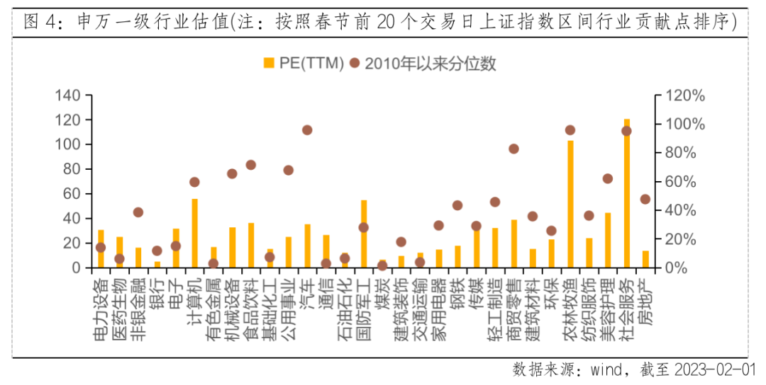 估值已恢复至2010年来中枢水平,仍存上修空间。以2023年2月1日收盘价为准,上证指数PE(TTM)为13.2倍,处于2010年以来45.5%分位,距离估值中枢约有6%的上修空间。从具体行业看,春节前20个交易日市场上涨贡献点前五的行业分别是电力设备、医药生物、非银金融、银行和电子,其估值水平仍处于2010年以来较低分位,短期内仍有修复空间。