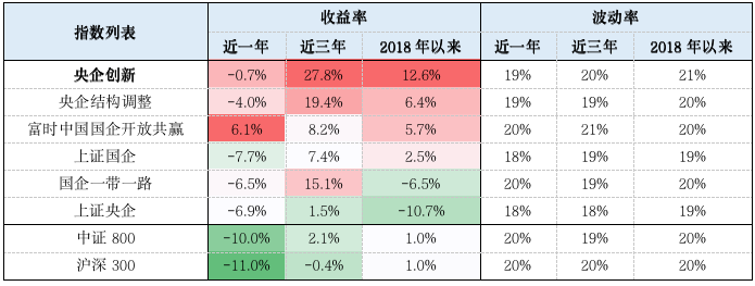 ➤ 从收益角度看:无论是近一年、近三年、还是2018年以来,大多数央国企指数,都涨赢了沪深300/中证800这类市场基准指数。其中,央企创新指数的表现很是亮眼,近三年收益率接近28%,同期沪深300指数收益率只有-0.4%。